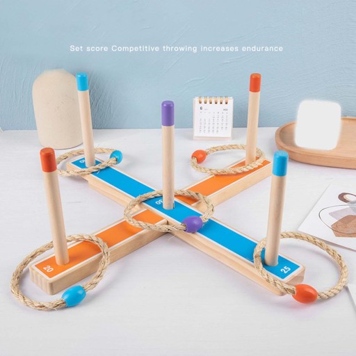 [Барвистий набір для метання] Набір включає 5 мотузкових кілець (2 помаранчевих, 2 синіх, 1 кольорових), 5 стовпчиків і 2 тверді дерев’яні основи з чіткими точковими позначеннями. Кільця для метання пенькової мотузки, високоякісна основа та колони з масиву дерева, гладка поверхня та краї.