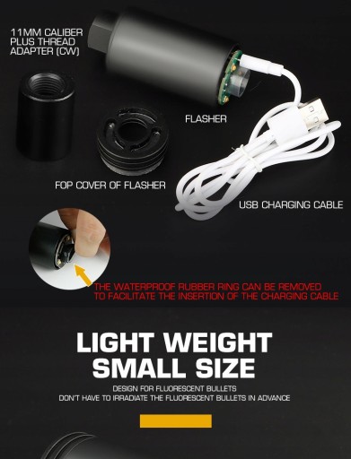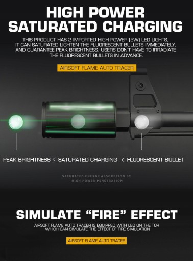 Високоякісний матеріал: корпус із алюмінієвого сплаву з вбудованим USB-зарядним пристроєм,більш міцний і водонепроникний. Це найкращий друг, щоб оновити свій глушник і змусити страйкбольні bbs світитися в темряві. Збільшити режим імітації Spitfire: перемикання між спалахом і режимом Spitfire. Підтримує функцію відстеження до 35 PRS (2100 RPM) Running fire. Цей трейлер страйкбольної зброї підтримує зелені світяться bbs або водяні бомби. Підходить для 10-мм пістолетів CCW і 14-мм автоматичних гвинтівок CW (від різьби M14 CCW до різьби M11 CW) Розумне енергозбереження: автоматичне вмикання та вимикання: автоматичне вимикання після 40 хвилин бездіяльності. Світлодіодний індикатор живлення/індикатор заряду батареї. Вбудована літієва батарея для USB-кабелю для зарядки. Її можна використовувати до 4 годин. Повністю заряджена батарея вистачить на 2000 раундів. Не працює? Батарея на тиждень: будь ласка, підключіть зарядний кабель, щоб зарядити, потім натисніть кнопку перемикача та утримуйте її, доки індикатор кнопки перемикача не почне блимати зеленим, ви можете від’єднати зарядний кабель і відпустити кнопку перемикача. Ви можете знову вставити зарядний кабель для заряджання, тоді акумулятор зможе перейти в нормальний робочий стан для роботи та використання. (Якщо індикатор не блимає, будь ласка, повторіть описані вище дії кілька разів, щоб розбудити акумулятор.)