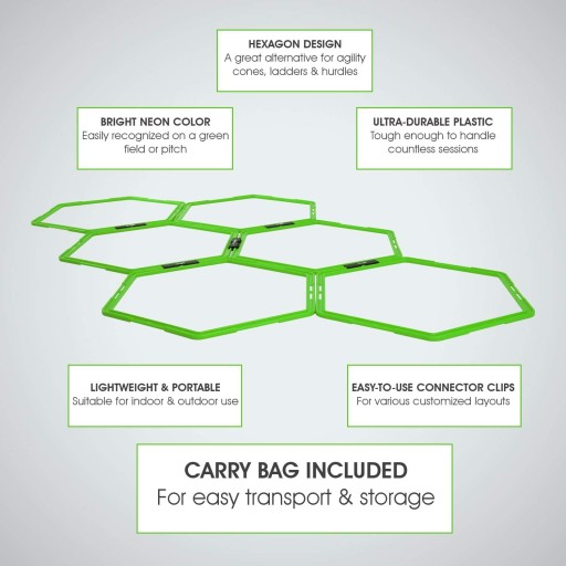 - НАБІР З 6 ШЕСТИКУТНИХ КІЛЕЦЬ ДЖІЛІТІ: Цей набір містить 6 з’єднаних між собою шестикутних кілець для спритності, кожне окреме кільце має діаметр 19 дюймів. Чудове обладнання для тренування спритності для тренувань ніг і спритності.