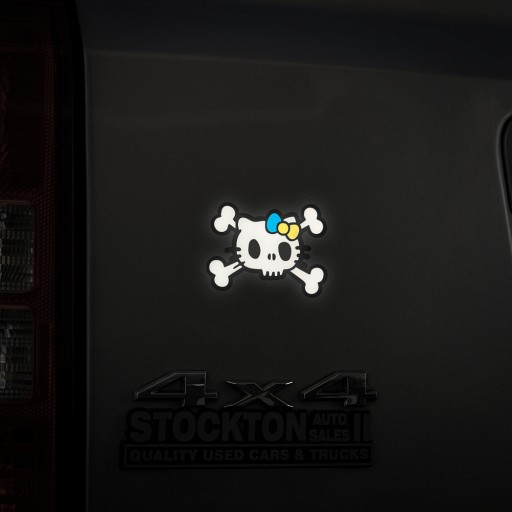 Наклейка зображує стилізовану та войовничу Хелло Кітті, відомий персонаж японської поп-культури, зображений у вигляді білої кішки японського бобтейла з бантом на голові.
