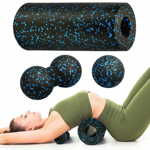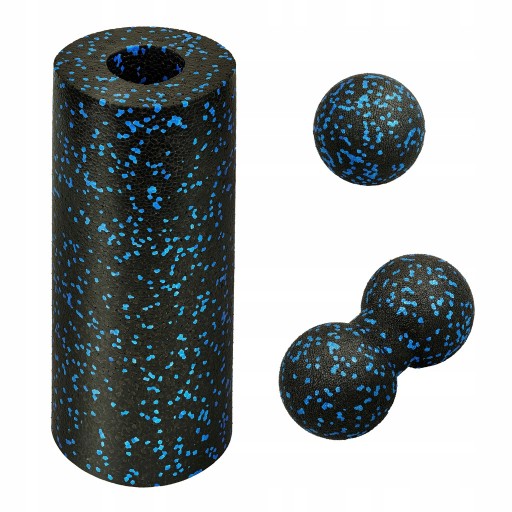 Масажний набір, що складається з трьох елементів: ролик, маленький м'яч і подвійний дуббол.