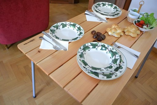 - Розкладний стіл з телескопічними ніжками 100х60 см. Стільниця з масиву модрини. Регулювання висоти від 66 см до 83 см.