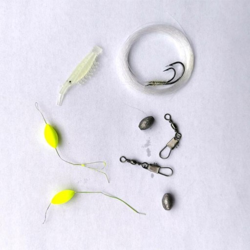 Рибальський гачок 2 Волосінь 1 Свинцеве грузило 2 Наживка для креветок 1 З’єднувач 2 Поплавець 2