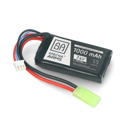Літій-полімерний акумулятор Specna ARMS загальною ємністю 1000 мАг. Вихідна напруга становить 7,4 В, а постійний струм розряду становить 30C/60C. Використовується в автомоделюванні, робототехніці або репліках AEG. Клеми акумулятора - це кабелі з роз'ємом Tamiya і виходом на балансир. Розміри виробу 11 х 33 х 77 мм.