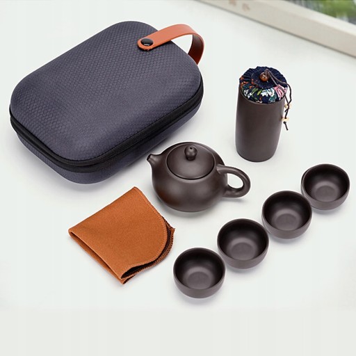 - Повний чайний набір включає чайник, 4 чашки, рушник для чищення, каністру для чаю та сумку для транспортування.