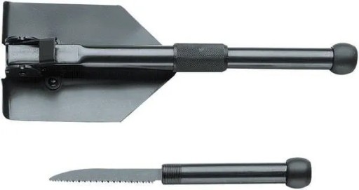 Лопатка-лопатка із загартованої чорної оксидованої сталі. Конструкція лопати дозволяє використовувати інструмент як лопату або мотику (можливість роботи під двома різними кутами: 90° і 180°). Для цього зафіксуйте ковш лопати в одному з двох положень за допомогою простого замкового механізму. Крім того, лопата оснащена великою пилкою для деревини із загартованої сталі, яка вміщується всередині ручки лопати. Лопата відрізняється надійним і зручним захопленням ручки.