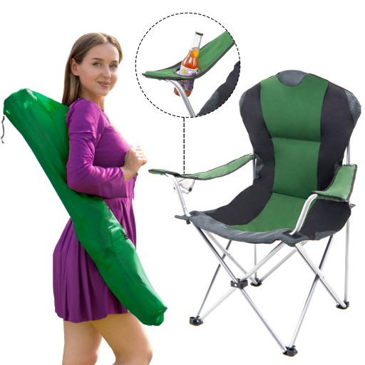 Розкладне зручне кемпінгове крісло з тримачем для пляшок чорно-зеленого кольору.