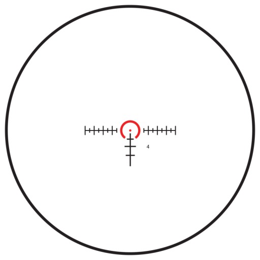 Універсальна тактична мілірадіанна сітка (MRAD) з компенсацією траєкторії (падіння) до 600 ярдів, з центральним колом для швидкого виявлення цілі на короткій відстані. Коло і центральна точка підсвічуються (див. фото).