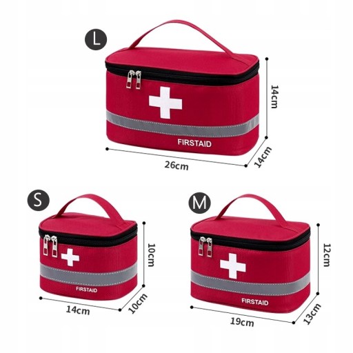 - Набір із 3 аптечок першої допомоги: Ми пропонуємо вам три аптечки різних розмірів, які ідеально підходять для різних ситуацій. Велика аптечка (26 х 14 х 14 см) вміщає більші упаковки ліків, середня аптечка (19 х 13 х 12 см) ідеально підходить для щоденного використання, а маленька аптечка (14 х 10 х 10 см) см) ідеально підійде для подорожей.