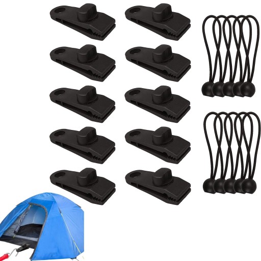 Затискач для намету та шнур для банджі: більшість із нас любить використовувати брезент і затискачі для колод для різноманітних потреб. Незалежно від того, збираєтеся ви пакувати речі для кемпінгу, закріплюєте намет, накриваєте навіс, займаєтеся садівництвом тощо. Ось чому нам потрібен цей інструмент, щоб це зробити. Упаковка містить 10 брезентових кліпс і 10 мотузок.