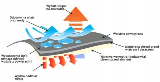 Куртка «дихаюча» завдяки використаній мембрані, яка зберігає тепло всередині та відводить зайву водяну пару назовні