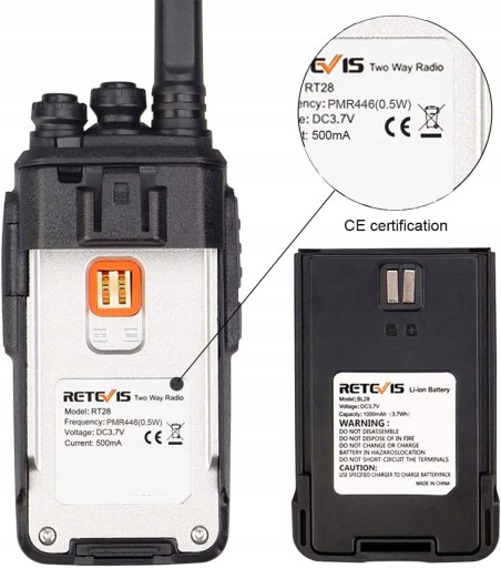 Батарея для рації; працює від літій-іонного акумулятора ємністю 1000 мАг; USB-кабель для зарядки 2 в 1; енергозбереження для продовження терміну служби акумулятора; попередження про низьку напругу
