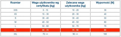 Купуючи жилет, його завжди слід підбирати відповідно до ваги користувача. Його сучасний дизайн і дуже широкий діапазон регулювання окружності талії роблять його ідеальним для всіх людей з певною вагою. Жилет розміру XL рекомендований людям вагою 70-90 кг.