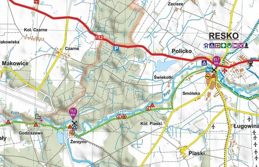 Картографічна частина: туристична та байдарочна карта Реги разом із прилеглими районами від Свідвіна до Мжежино, легенда польською, німецькою та англійською мовами.