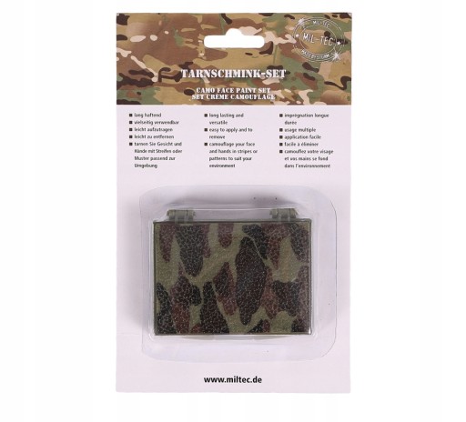 Продукт німецької компанії Mil-Tec®. Ідеально підходить для маскування обличчя та рук. Функціональний ящик з міцного пластику на 7 відділень з кольоровою фарбою для різних пір року і різних типів місцевості.