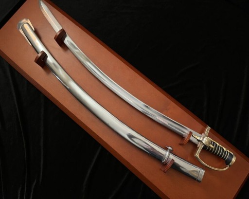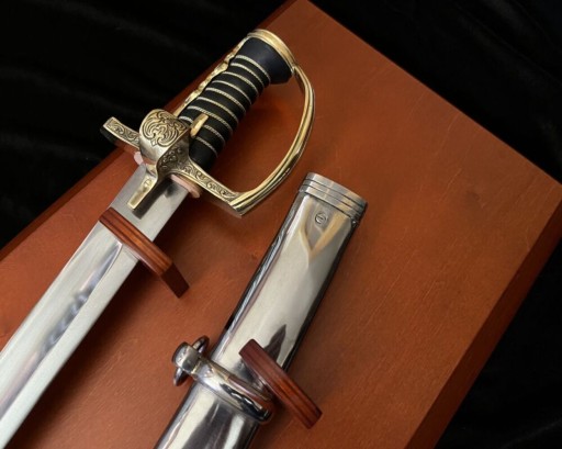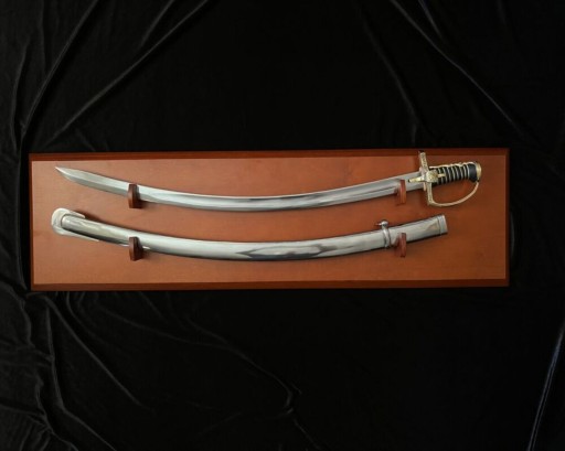 Ця шабля має трохи вигнуту ручку. Закрита гарда (нахилена під кутом 105˚ до поперечини) захищала руку і забезпечувала правильний баланс зброї. Латунний ковпак, що прикривав задню частину рукояті, посилював хват. Латунна хрестовина з вусом зміцнювала зброю в найслабшому місці – там, де клинок з’єднується з руків’ям, і додатково захищала руку. Латунний палець, розташований посередині хрестовини, дозволяв краще контролювати шаблю під час атаки.