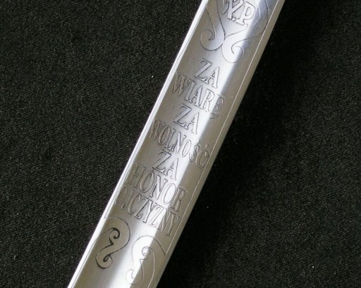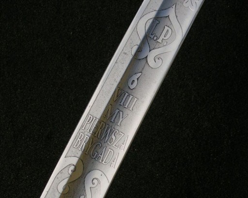 Полірований сталевий клинок, з невеликою кривизною, відшліфований з обох сторін в єдиний шар. Перо з сильно вираженою спинною кісточкою, двостороннє, децентричне гравіювання. На внутрішній поверхні клинка в картуші, прикрашеному дубовим листям, викарбувані літери Л.П., напис 6 / VIII / МОЯ / ПЕРША / БРИГАДА, внизу, на тлі перехрещених шаблі, рушниці та ствола гармати, значок « За вірну службу» (заснований Юзефом Пілсудським у серпні 1916 року) і датою 1914 рік.