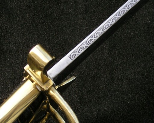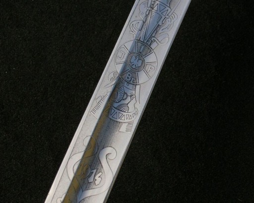 На внутрішній поверхні клинка в картуші, прикрашеному дубовим листям, викарбувано літери L.P., напис 6 / VIII / МИ / ПЕРША / БРИГАДА, унизу на тлі перехрещених шабель, рушниць і ствола гармати нагрудний знак «За вірну службу» і дата 1914р.
