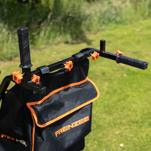 Великий візок, в який поміститься все ваше спорядження! Frenzee має дворівневу систему зарядки! Ви можете завантажити сумку стрижнями на нижній рівень, щоб у вас був швидкий і легкий доступ до стрижнів, не турбуючись, що багаж з верхнього рівня її роздавить. Довжину коляски можна регулювати. Ручки можна розташувати вертикально або горизонтально. У комплекті з коляскою є велика сумка, яка розміщується на спинці коляски, і кільце для відра.