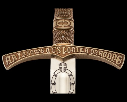Латинські написи на хрестовині та наверші: Тримається драконом, який не спить, і в ім'я правди