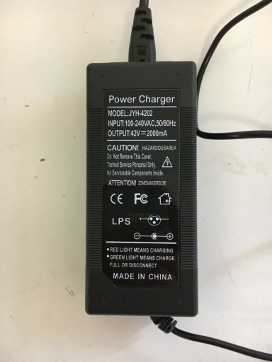 Зарядний пристрій для скутера: вхід AC100-240V 50/60Hz, вихід DC 42V2A, потужність 84W, зарядка літієвої батареї 36V, діаметр інтерфейсу 8mm, перед покупкою перевірте, чи параметри продукту, які вам потрібні, збігаються з параметрами нашого продукту, якщо продукт Якщо Напруга і діаметр інтерфейсу зарядки однакові, його можна використовувати як запасний зарядний пристрій.