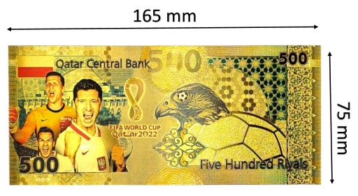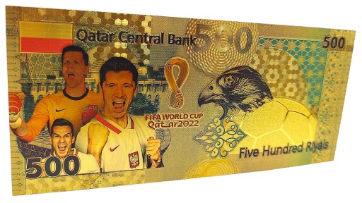 Красива позолочена банкнота номіналом 500 ріалів із зображенням збірної Польщі.