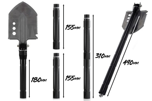 - Ніж можна розташувати в кожному з елементів рукояті, а лопату та інші головки можна прикрутити тільки до першого елемента (без виступаючої різьби).