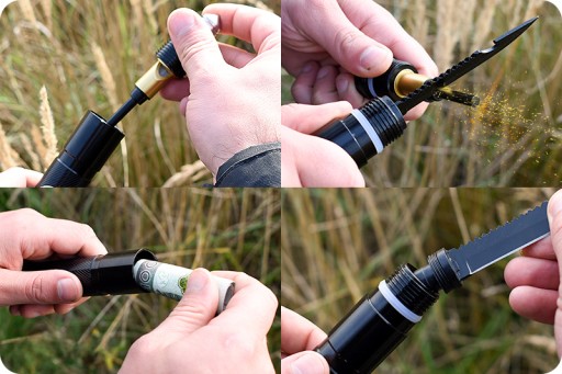 - Розпалювач вогню в поєднанні зі свистком дозволить розпалити вогонь в екстрених ситуаціях, а свисток дозволить покликати на допомогу або сигналізувати друзям. Щоб витягнути іскри з розпалювача, просто енергійно проведіть лезом по карбоновому стрижню.