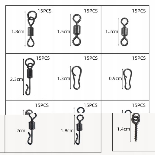 В упаковці 30 насадок проти сплутування (S L); 15хВертлюг з кільцями; 15x швидкозмінний вертлюг з кільцями; 15x вертлюги з великими очима; 30x поворотні вертлюги (S L); 30xШвидкозмінні поворотні пристрої (S L); 30x Link Swivel Quick changes (S L); 15 гвинтів для наживки для бойлів; 20 намистин для риболовлі; 100x намистин для фіксації гачків