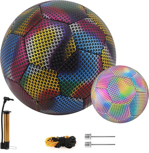 Голографічний світловідбиваючий футбольний м'яч виготовлений з світловідбиваючої PU-шкіри преміум-класу, при попаданні світла на це покриття виникає світловідбиваючий ефект, сам футбольний м'яч не світиться. З деяких ракурсів воно виглядає темним, але якщо подивитися на світло, воно може бути дуже яскравим. Ідеальний сяючий футбольний ефект — робити фото чи відео з увімкненим спалахом.