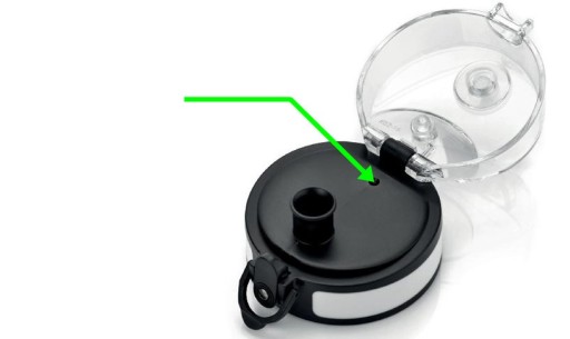✔️Під час пиття вентиляційний отвір має бути над мундштуком. Його неправильне розташування може призвести до неконтрольованого витікання рідини (на фото отвір позначено зеленою стрілкою)