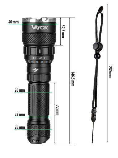 Модель VA0099 Pro - це міцний, водонепроникний тактичний і вуличний ліхтарик, який має два основних діода (біле світло) + XPE діод (зелений і червоний світло) - ідеально підійде як ліхтарик для силових служб, охоронців, на вулиці, 3 кольори світла ідеально підходять для використання службами для сигналізації. Світлодіод забезпечує світловий потік до 1500 люмен і радіус дії до 480 метрів.