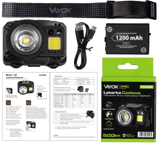 Професійна модель налобного ліхтаря VA0098 - наш новий продукт, який є розширенням існуючих моделей. Оснащений світлодіодом XPG3 6W + додаткова світлова панель COB (загальна потужність 500 люмен). Ви можете вибрати між білим або червоним світлом, керованим вручну або за допомогою датчика руху. Новинка — функція масштабування, тобто регулювання світлового променя (сфокусований або розсіяний). Доповнює все це гібридна зарядка, яка збільшує час роботи ліхтарика.