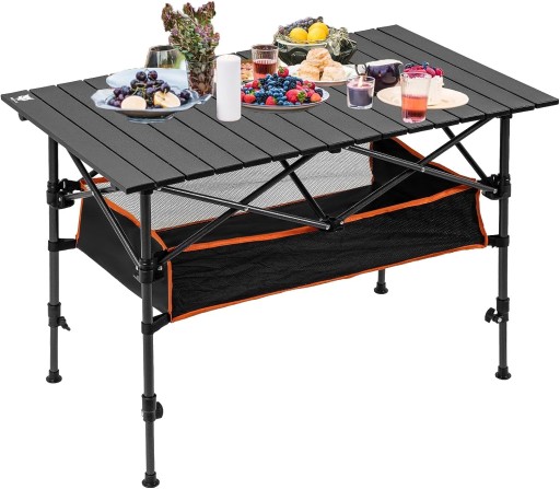 Стіл для кемпінгу з нічним котом і кошиком для зберігання. Складаний стіл для пікніка на відкритому повітрі. Легкий, нержавіючий, регульована висота 50-95 см. Барбекю у дворі. Сад. 75 кг. Розміри 55 x 95 см.