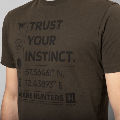 Футболка виготовлена з м'якої та еластичної чесаної бавовни. На грудях принт з логотипом Harkila і написом «довіряй своєму інстинкту». Футболка має класичний крій, круглий горловину, контрастну стрічку для підсилення та невеликий значок із логотипом на потилиці.