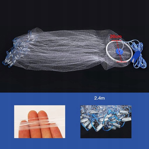 Параметр: Діаметр: 2,4 метри Сітка: 1 палець Довжина мотузки: 12 метрів Матеріал: мононитка Список пакетів: 1 x рибальська сітка