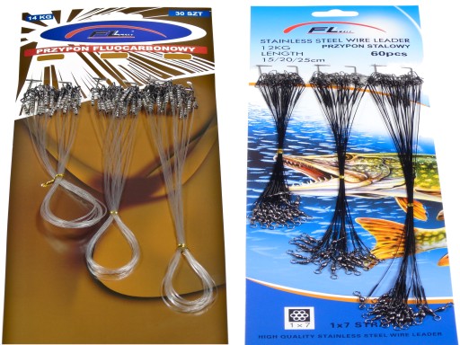 Набір лідерів Fluocarbon. Кількість 30 шт. Довжина - 15, 20 см, 25 см, міцність - 14 кг. Тобто по 10 штук кожного виду. I. Набір сталевих поводків в чорному покритті, кількість 60 шт Довжина 15 см, 20 см, 25 см, міцність - 12 кг. Тобто по 20 штук кожного виду.