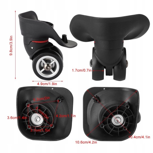 Особливості: 1. Високоякісний нейлоновий матеріал робить колеса міцними, легкими та довговічними у використанні, що має тривалий термін служби. 2. Конструкція колеса Mute, без шуму, що може забезпечити тишу під час використання. 3. Легко встановити, не потрібні складні інструменти для ремонту, що зручно у використанні. 4. Конструкція з подвійним підшипником має чудову несучу здатність, що робить колеса гнучкими та простими у використанні. 5. Чудова заміна коліс валізи, яка є практичним доповненням.