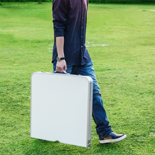 У складеному вигляді весь стіл утворює валізу, в яку ми можемо сховати стільці та носити все це за зручні ручки. Крім того, стіл закріплений швидкими замками, тому ми можемо бути впевнені, що валіза не відкриється під час транспортування та транспортування!