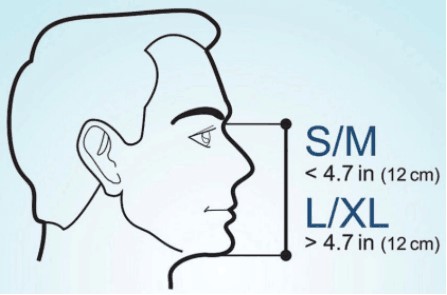 Маска доступна в двох розмірах: S/M і L/XL. Щоб вибрати правильний розмір, виміряйте відстань від верхнього краю носа до нижнього краю підборіддя, згідно з інструкцією.