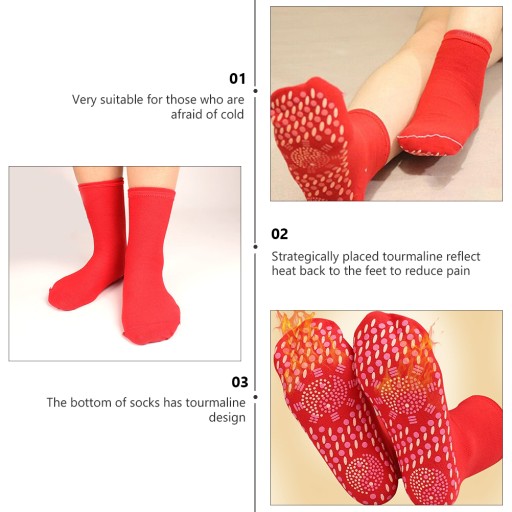 Самогріючі шкарпетки виготовлені з практичних і міцних матеріалів. Низ шкарпеток має структуру нагрівання, яка дозволяє зберегти тепло в холодні дні. Вони ефективно знімають біль і втому в ногах, регулюють роботу нервової системи і забезпечують масаж стоп.