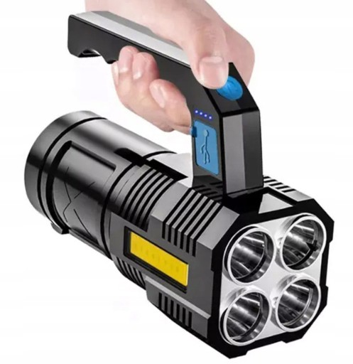 Тактичний ліхтарик з надпотужним світлодіодом COB (збоку) і 4 діодами T6, укладений у дуже міцний корпус. Ліхтарик має дуже потужне джерело світла з тривалим терміном служби. Надійна, міцна ручка у верхній частині забезпечує міцний хват і зручне використання. Ліхтарик також водо- та ударостійкий. Перемикач захищений міцною гумою, а ущільнювальні кільця захищають пристрій від бруду та пилу. Збоку є додаткові світлодіоди. Вбудований акумулятор заряджається за допомогою USB-кабелю, що входить в комплект, а рівень його заряду видно за допомогою світлодіодного індикатора.
