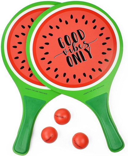 - Гейм, сет, матч! Кидайте цей м’яч швидше за метеор із пляжними битами на тему кавуна від Legami. У набір входять: 2 ракетки з ергономічною ручкою, 3 м'ячі з ПВХ і зручна прозора сумка для перенесення. Готові тріумфувати в прямих кадрах і під дощем на пляжі чи в парку?