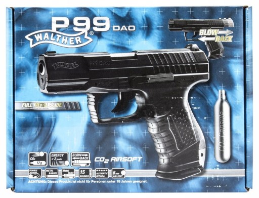 Walther P99 DAO - сильна CO2 страйкбольна копія, газова система Blow-Back, металевий замок, магазин на 15 BBs, 520 FPS, сила приблизно 2J + 2700 BBs 0,20 г + ЗАХИСНІ ОЧКИ + 10 СТРІЛЬСЬКИХ ДИСКІВ 14x14 см + 10 CO2