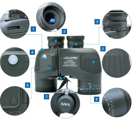 Особлива конструкція, вбудований далекомір для вимірювання відстані, а також вбудований компас з підсвічуванням. Усе це робить бінокль USCAMEL чудовим інструментом для спостереження за об’єктами, природою, подіями тощо.