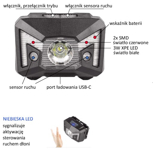 Ліхтарик має вбудований датчик руху, включається натисканням кнопки вгорі ліхтарика.При включенні датчика з'являється синій світлодіод, який сигналізує про правильну роботу.