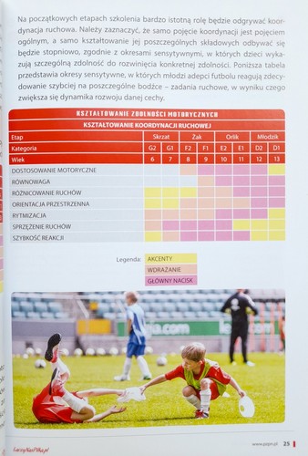 : Це офіційне видання Польського футбольного союзу, видане в рамках Академії молодих орлів програми Grassroots PZPN. Книга містить програму футбольних тренувань від гнома до юнака, засновану на Академії молодих орлів, розширену для задоволення потреб Програми сертифікації футбольних шкіл Польської футбольної асоціації. Книга складається з п'яти основних частин. Перший містить вступ щодо, серед іншого, пріоритети та основи у навчанні дітей та молоді та схема навчання.