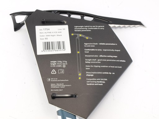 * пряма рукоятка забезпечує надійне закріплення на снігу * агресивний передній кінчик, звужений до 3 мм * загострене лезо для ефективного рубання * отвір у голові для підключення петлі або карабіна * ручка з отвором і гострим твердосплавним наконечником * сумісний з аксесуарами Salewa : 1094 Охорона кирки, 1753 Шипи для льодоруба, 1752 Відпочинок, 1743 Повідець