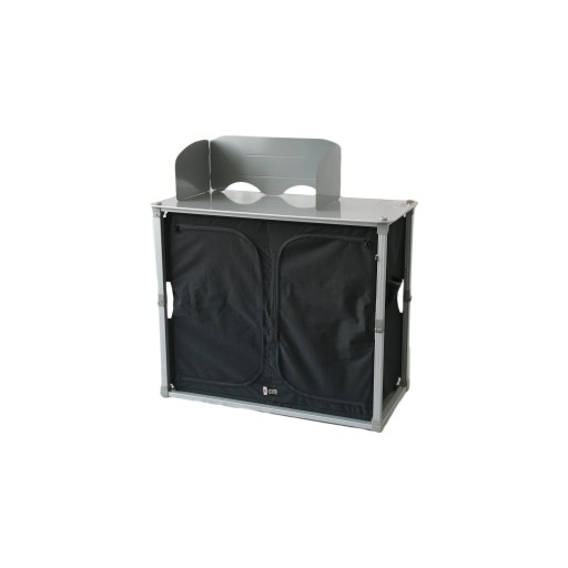 Двомісна похідна кухонна шафа для намету. Виготовлений з матеріалів найвищої якості. Завдяки використанню новітніх конструктивних рішень, розкладання шафи відбувається дуже швидко і зручно, використання нових, більш міцних квадратних профілів зміцнює конструкцію шафи, що забезпечує більшу стійкість до навантажень. Шафа має дві полиці з лівого і правого боку, верхні з яких знімні і складаються в одну велику шафу, а на задній стінці є вентиляція. Зліва і справа кишеня. Кожна ніжка має регулювання рівня. Стільниця стійка до вологи та високих температур.