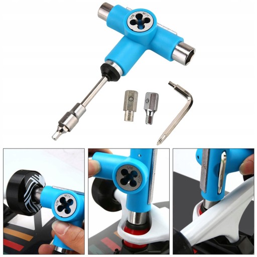 : Багатофункціональний універсальний інструмент із тріскачкою та ковзанами забезпечує все, що вам потрібно, щоб затягнути або відремонтувати скейтборд. Інструмент T-Skateboard містить гнізда 3 різних розмірів (3/8", 1/2", 9/16") та висувний викрутка з хрестовою головкою, яка надягає верхню частину ручки, коли не використовується. Цей інструмент для катання можна використовувати для заміни коліс, очищення підшипників, регулювання гаек осі, кріпильного обладнання та гайки шкворня на верхній частині вашої вантажівки Портативний і легкий, ви можете легко носіть і використовуйте його, коли вам це потрібно. Підходить для більшості типів скейтбордів, лонгбордів, пеннібордів, міні-круїзерів тощо